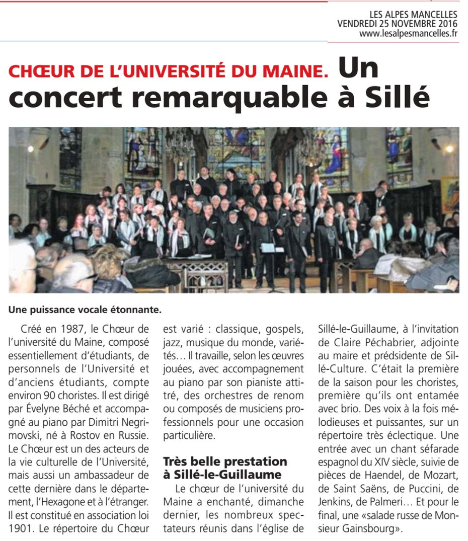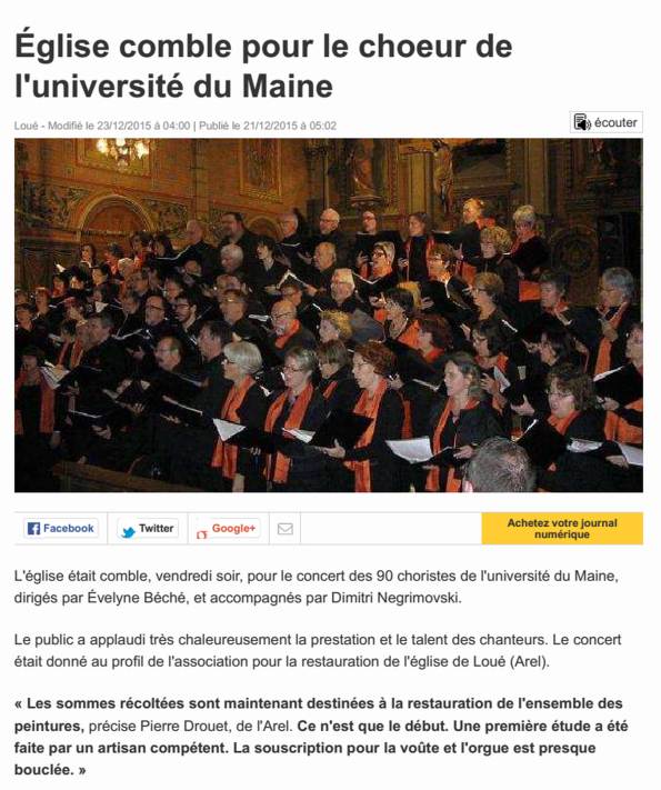 C'est un concert de toute beauté qui termine merveilleusement le cycle cultruel et musical 2014. Le public est venu en nombre écouter le Choeur de l'Université du Maine. Ouest-France, 2014