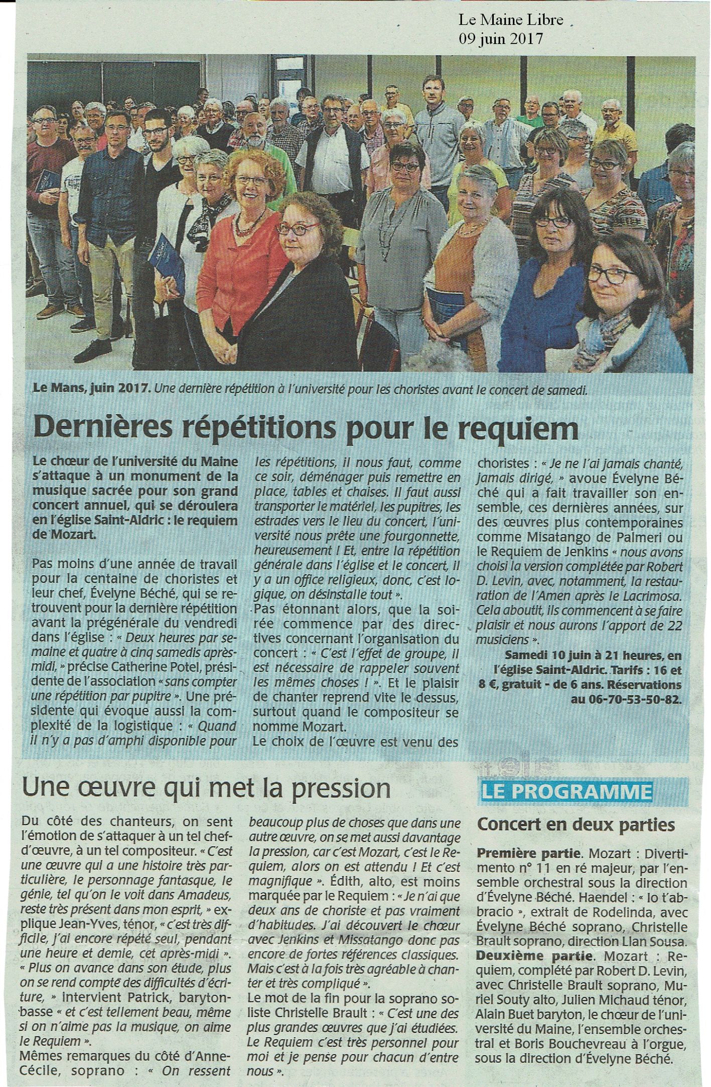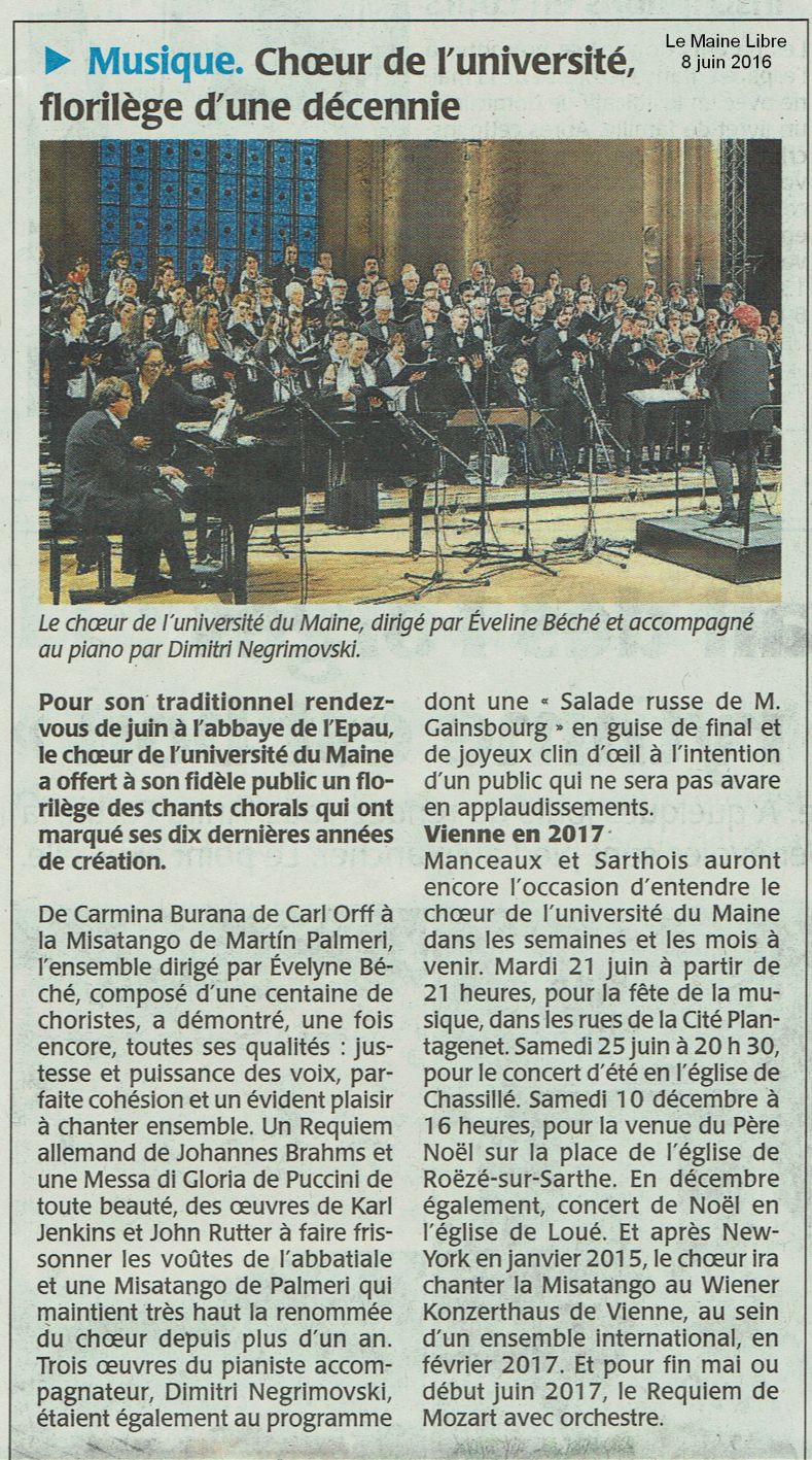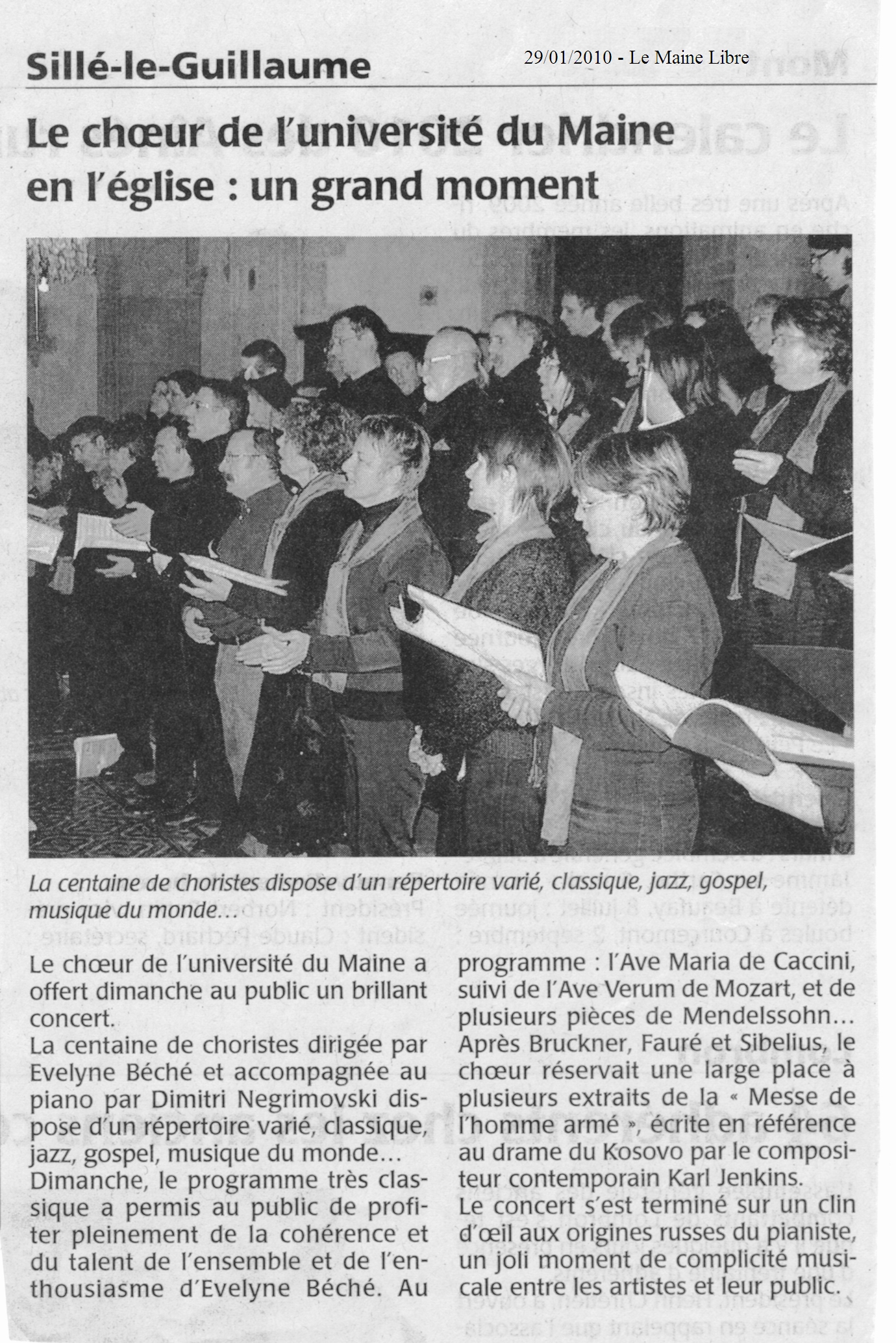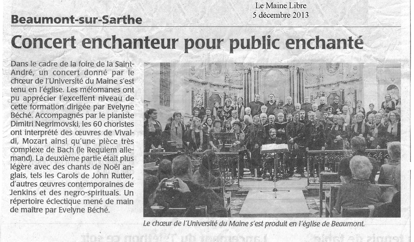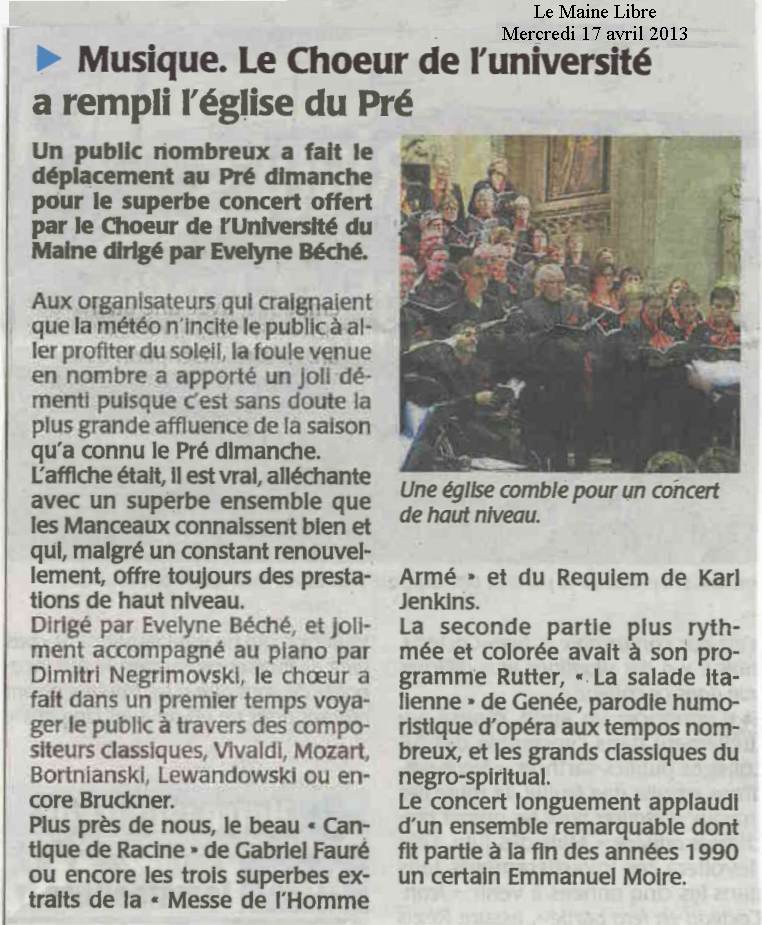 Le Choeur de l'Université à rempli l'église du Pré. (...) un superbe ensemble que les Manceaux connaissent bien et qui, malgré un constant renouvellement, offre toujours des prestations de haut niveau. Le Maine Libre, 2013