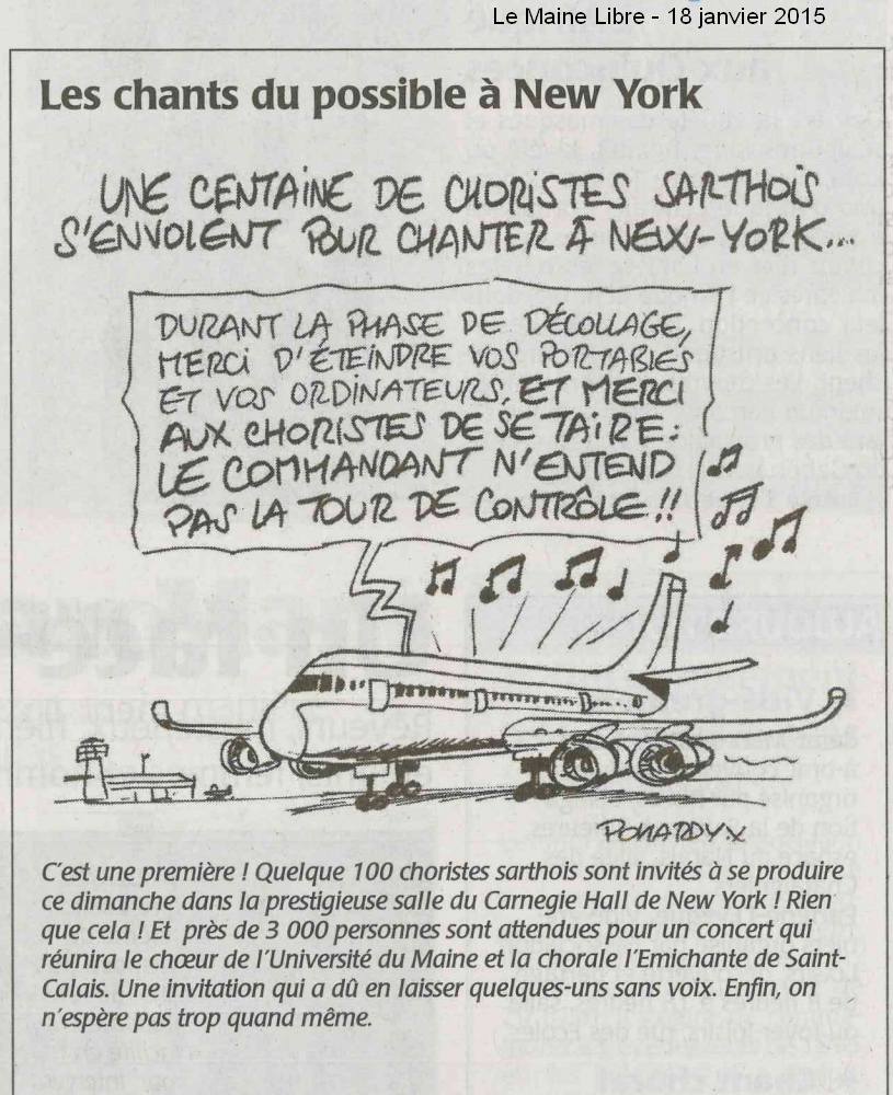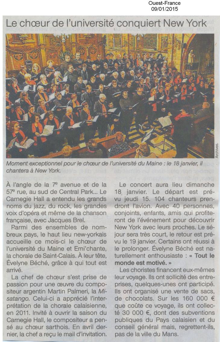 Le Choeur de l'Université conquiert New-York. Moment exceptionnel pour le Choeur de l'Université : le 18 janvier, il chantera à New-York. Ouest-France, 2015.
