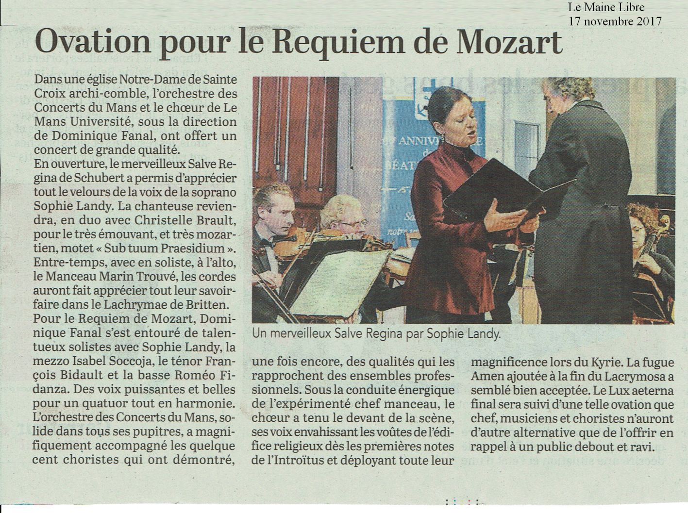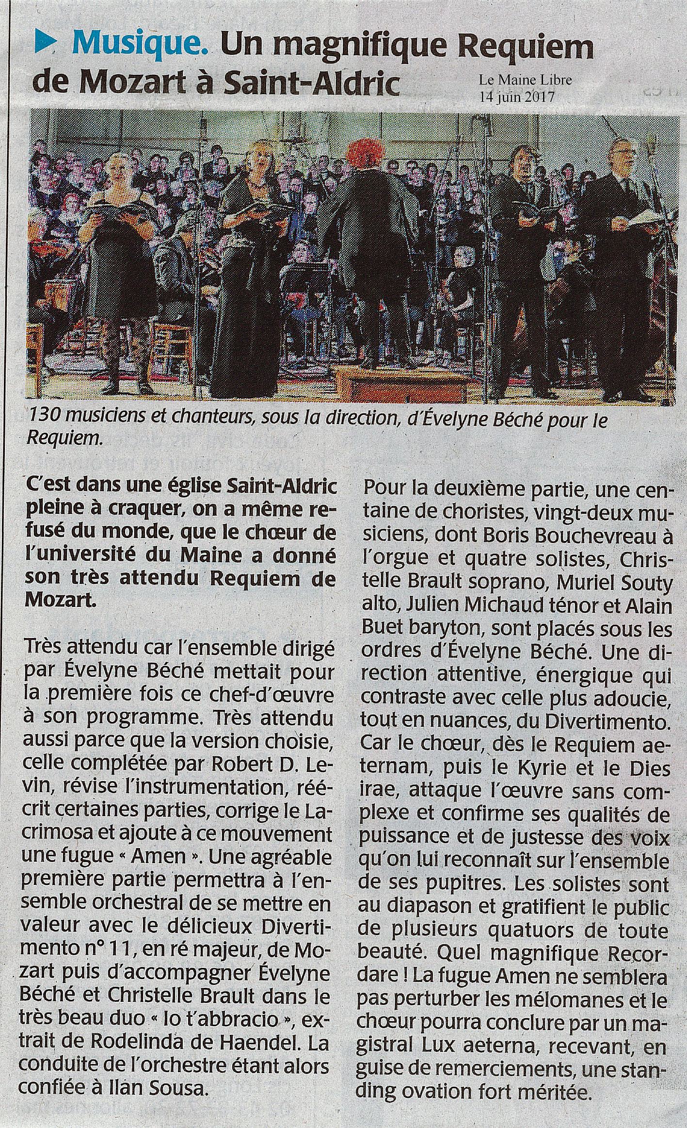 Une messe pour les défunts parfaitement mise en valeur par l'interprétation exemplaire des chanteurs, choeurs et solistes, accompagnés par de talentueux musiciens. Evelyne Béché allait diriger avec passion l'ensemble du concert. Le Maine Libre, 2014.