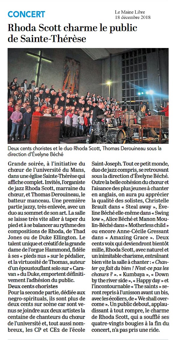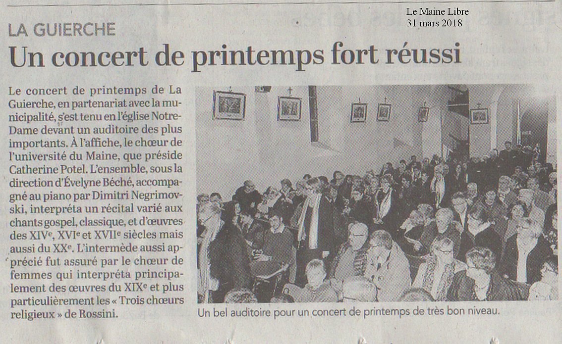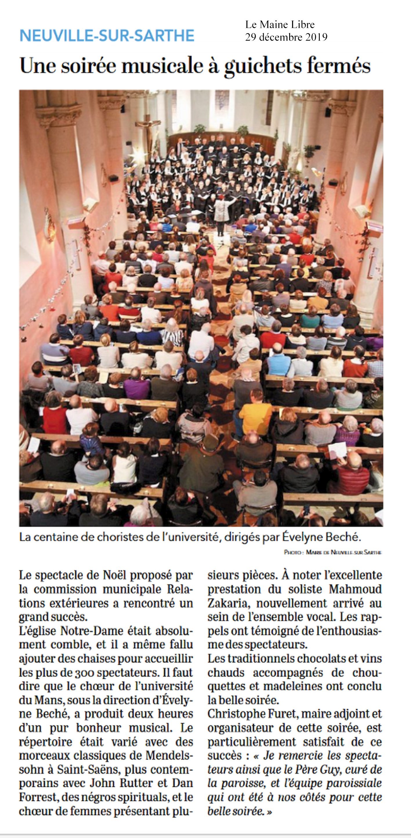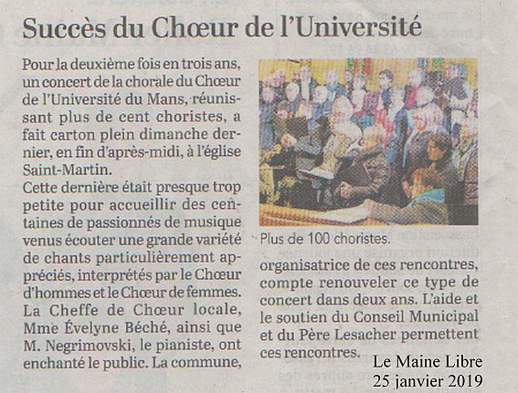 Une soirée musicale à guichets fermés. (...) le choeur de l'université du Mans, sous la direction d'Evelyne Béché, a produit deux heures d'un pur bonheur musical. Le Maine Libre, 2019.