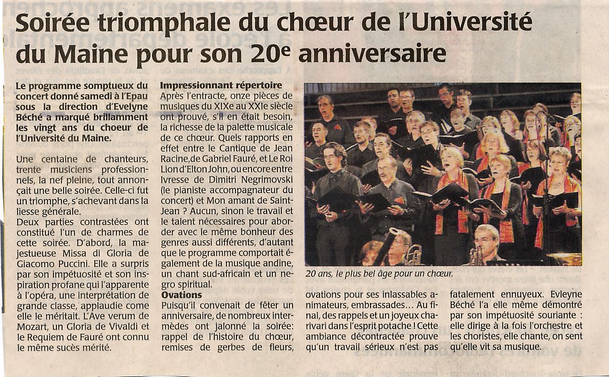 Soirée triomphante du Chœur de l'Université du Maine pour son 20ème anniversaire. Impressionnant répertoire - Maine Libre, 2008