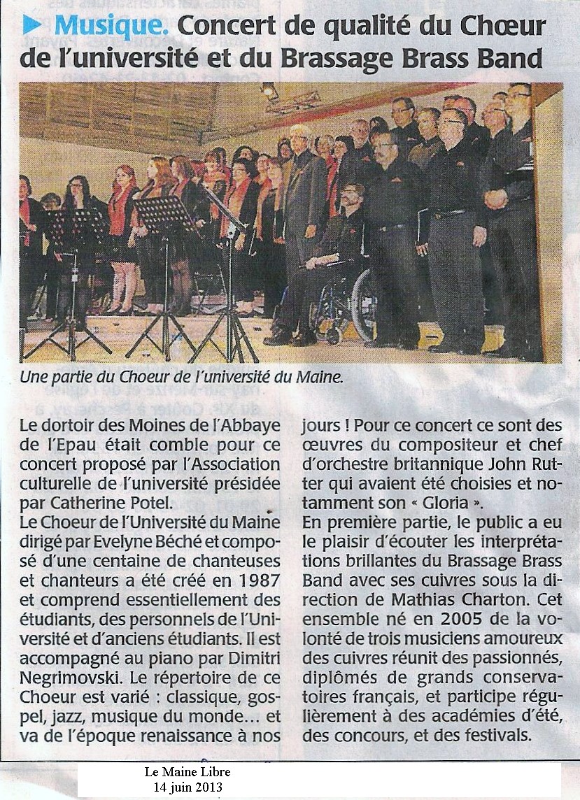 Concert de qualité du Choeur de l'Université et du Brassage Brass Band. Le dortoir des Moines de l'Abbaye de l'Epau était comble pour ce concert. Le Maine Libre, 2013.