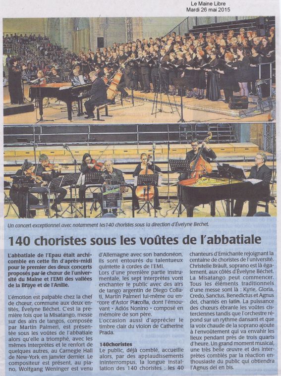 L'abbatiale de l'Epau était archicomble. Un grand moment musical, une très belle oeuvre et des interprètes comblés par la réaction enthousiaste du public. Le Maine Libre. 2015