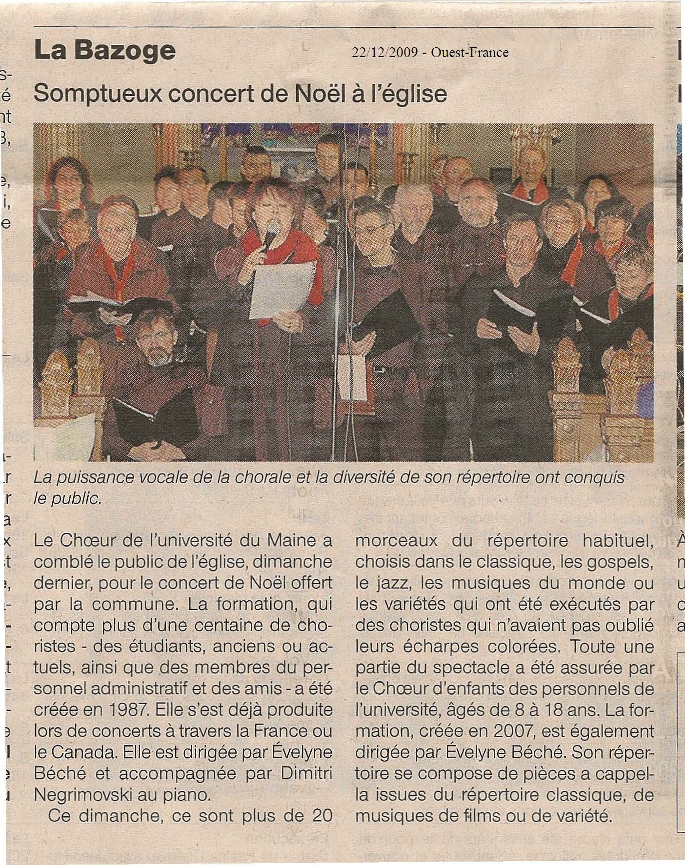 Somptueux concert de Noël à l'église. La puissance vocale de la chorale et la diversité de son répertoire ont conquis le public. Ouest-France, 2009