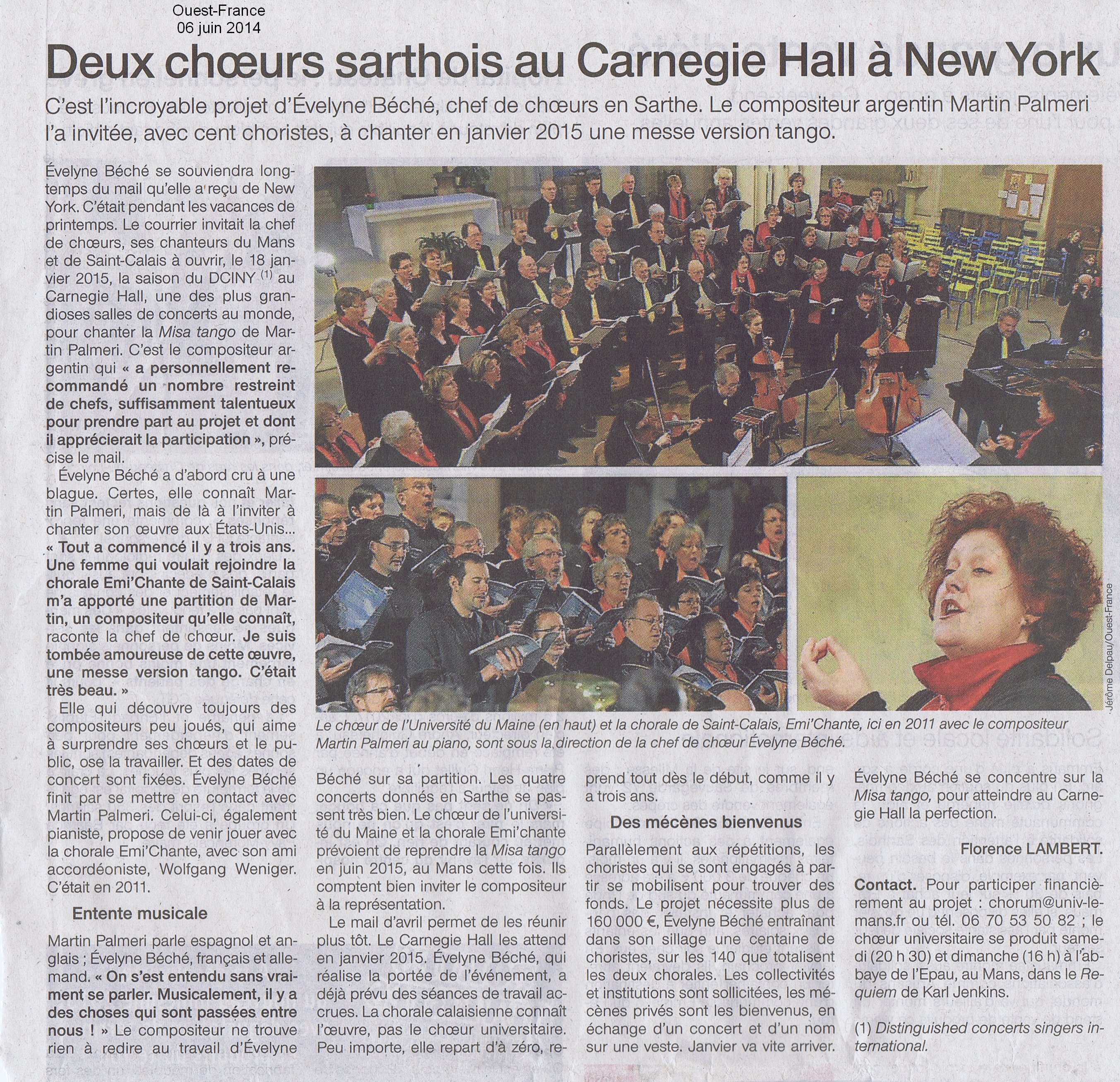 Deux choeurs sarthois au Carnegie Hall à New-York. C'est l'incroyable projet d'Evelyne Béché, chef de choeur en Sarthe. Le compositeur argentin Martin Palmeri l'a invitée, avec cent choristes, à chanter en janvier 2015 une messe version tango . Ouest-France, 2014.