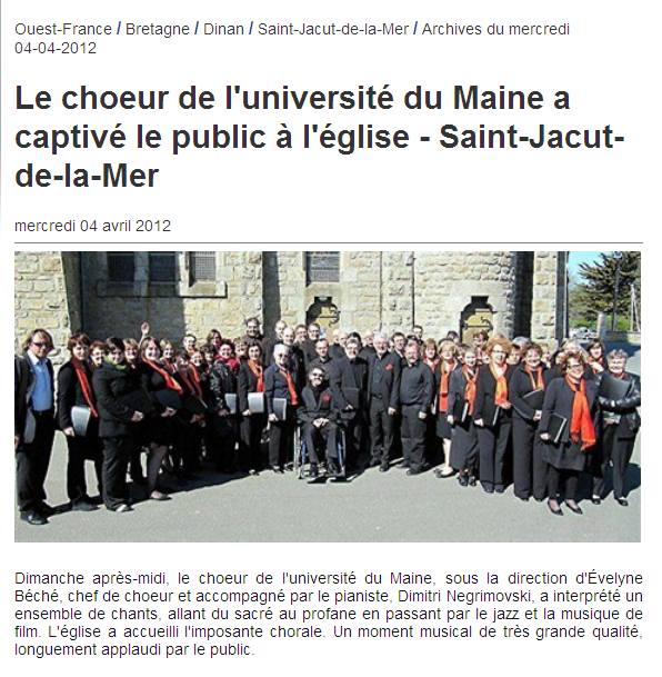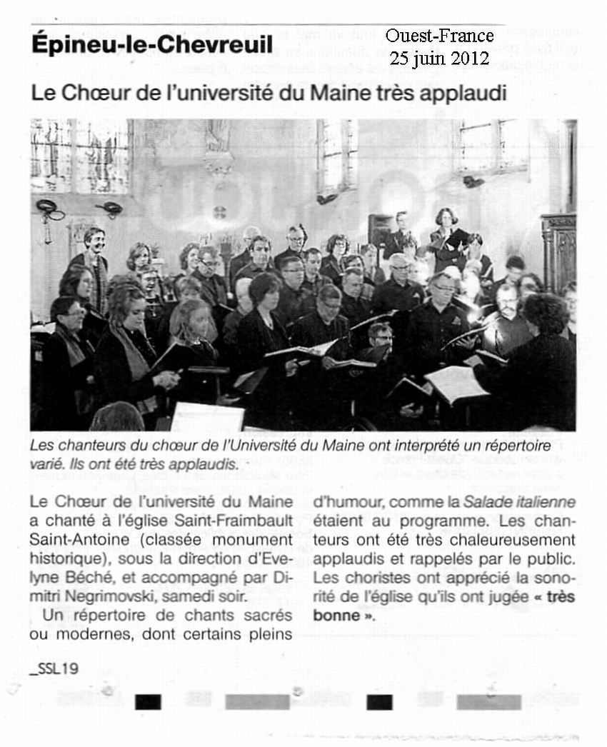 Le Choeur de l'Université du Maine très applaudi. Un répertoire de chants sacrés ou modernes, dont certains pleins d'humour, comme la Salade Italienne étaient au programme.Ouest-France, 2012