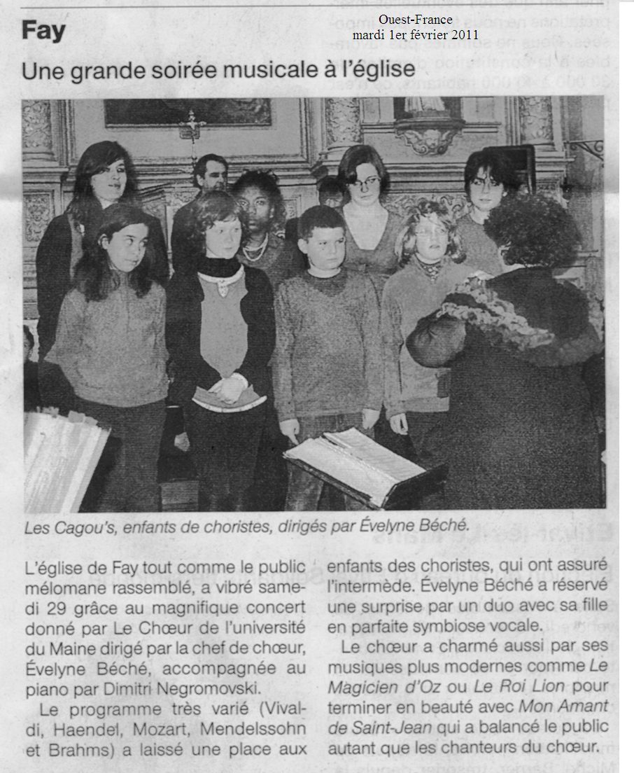 Une grande soirée musicale à l'église. Le programme très varié (...) a laissé une place aux enfants des choristes. (...) Evelyne Béché a réservé une surprise par un duo avec sa fille en parfait symbiose vocale. Ouest-France, 2011