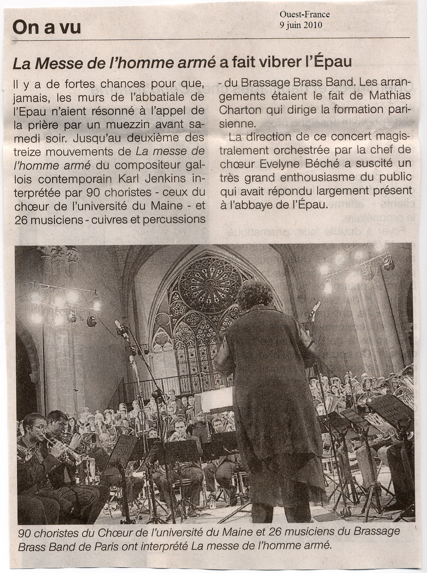 La Messe de l'homme armé a fait vibrer l'Epau. La direction de ce concert magistralement orchestrée par la chef de chœur Evelyne Béché a suscité un très grand enthousiasme du public qui avait répondu largement présent à l'abbaye de l'Epau. Ouest-France, 2010
