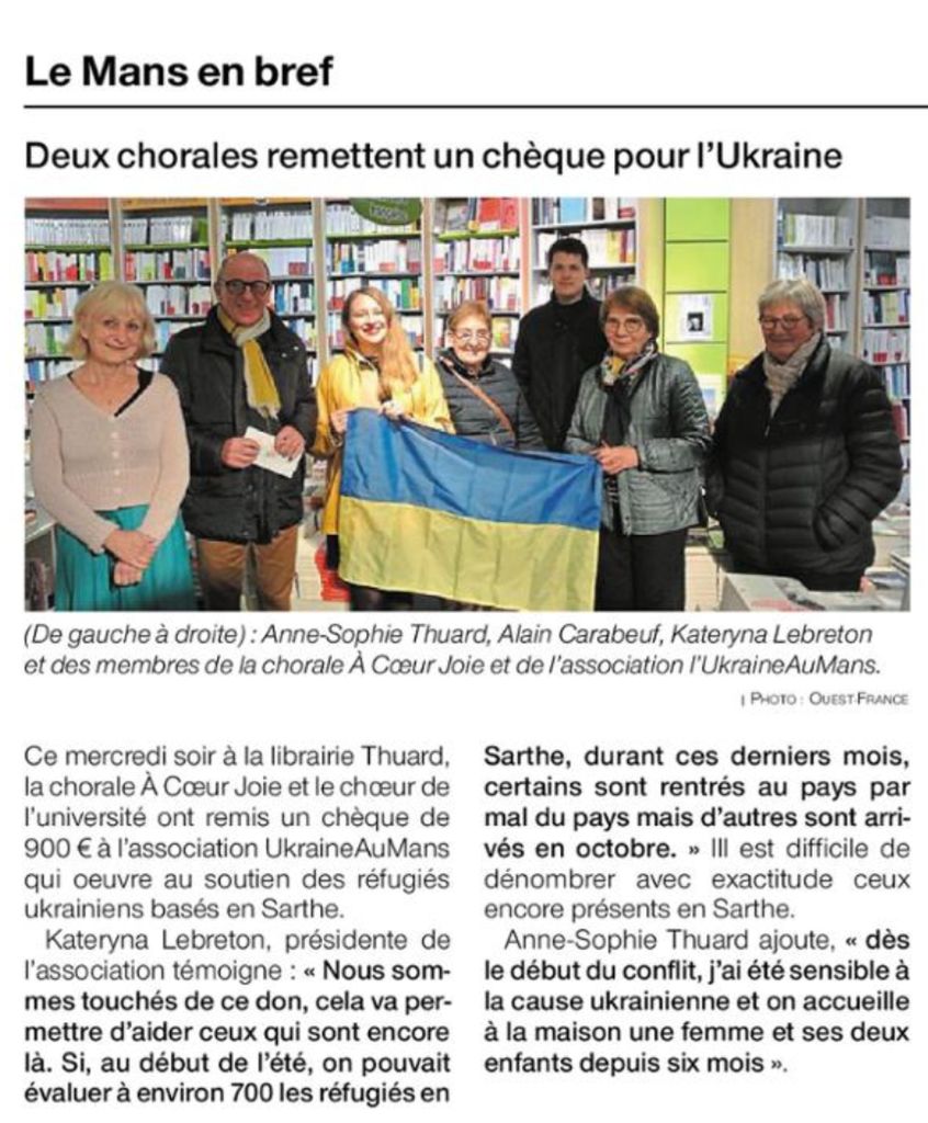 Deux chorales remettent un chèque pour l'Ukraine (...) la chorale A Coeur Joie et le Choeur de l'Université ont remis un chèque de 900 € à l'association UkraineAuMans qui œuvre au soutien des réfugiés ukrainiens basés en Sarthe. Ouest-France, 2022