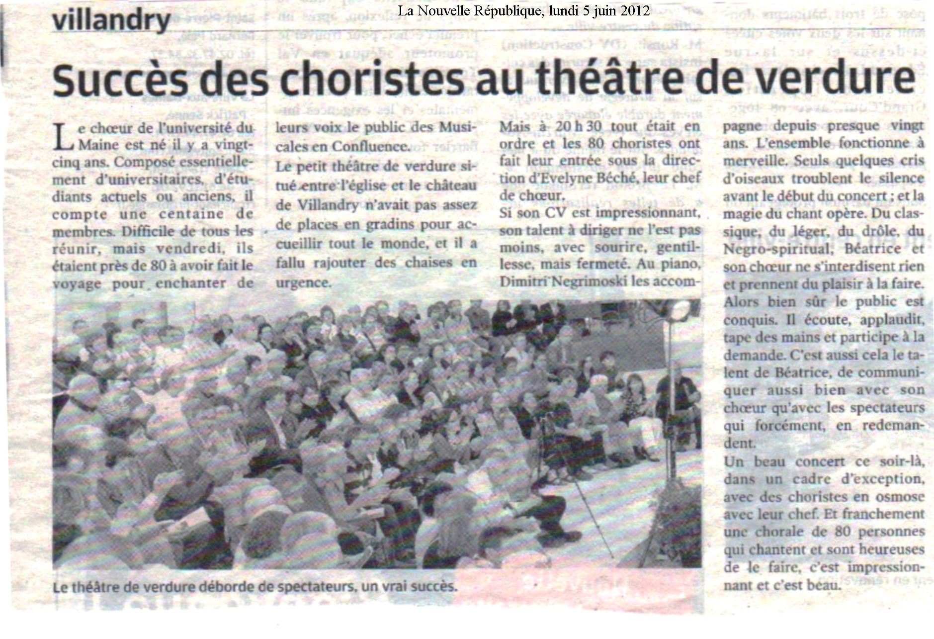 Succès des choristes au théâtre de verdure. Si son [celui d'E. Béché] CV est impressionnant, son talent à diriger ne l'est pas moins, avec sourire, gentillesse, mais fermeté. (...). Un beau concert ce soir-là, dans un cadre d'exception, avec des choristes en osmose avec leur chef. La Nouvelle République, 2012